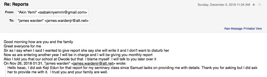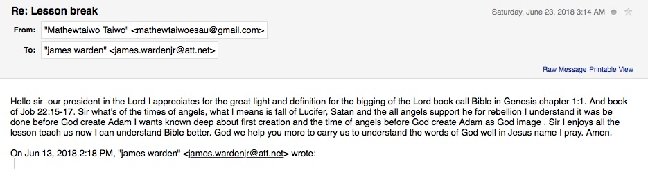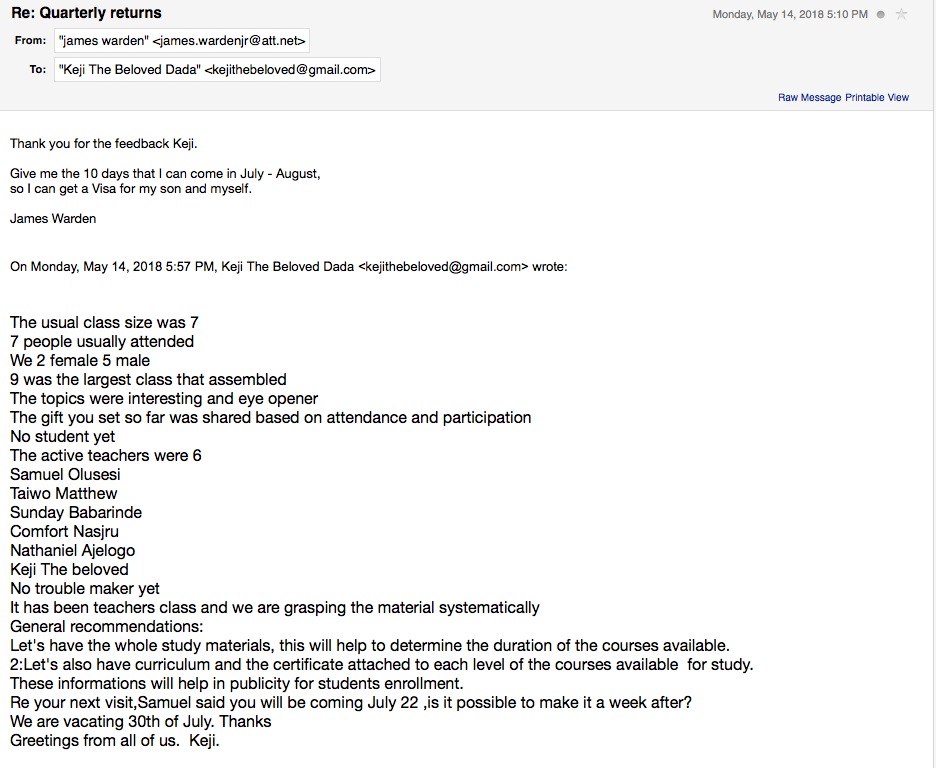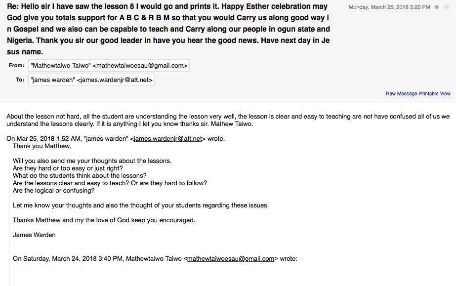 After I submitted the lessons below for the first quarter of my teachers’ development training, I gave them the test and their team lead went over the answers in class and she related to me that they were so happy for having their understanding broadened. I requested feedback during that first quarter about the difficulty of the lessons and I received the following feedback. Matthew Taiwo's feedback regarding ABC's lessons that I developed. The materials appeared to be understandable according to this pastor's testimony. After the first quarter, I requested the quarterly report and received the follow summary. This is the report for the first quarter. This reports show no students except for the six teachers who were learning the doctrine to be able to share this information with others.