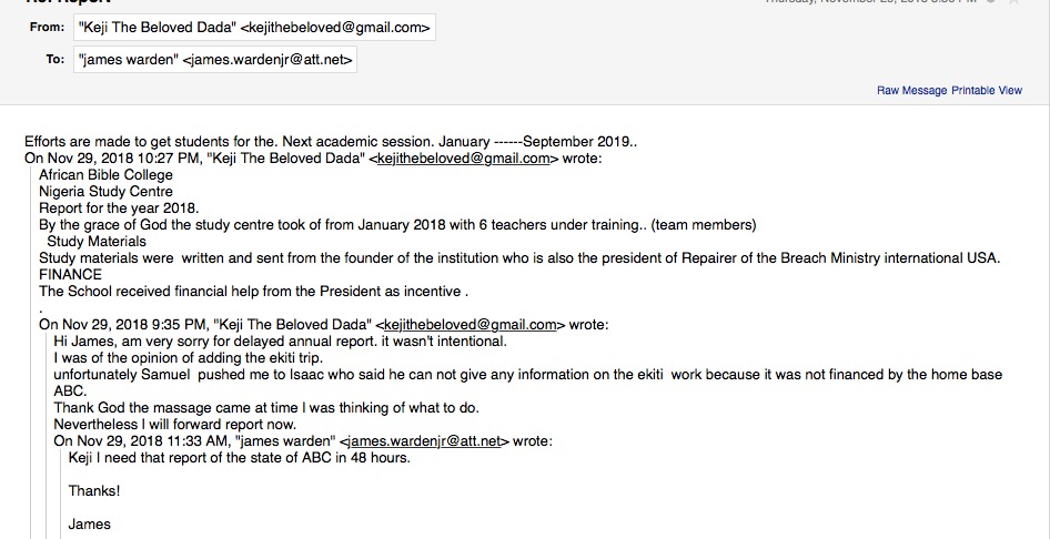 In regards to the African Bible College, ABC is staffed with volunteer Bible training leaders who lead the weekly training lessons that I will develop. I will email them these teachings and request updates on how the training classes are performing.